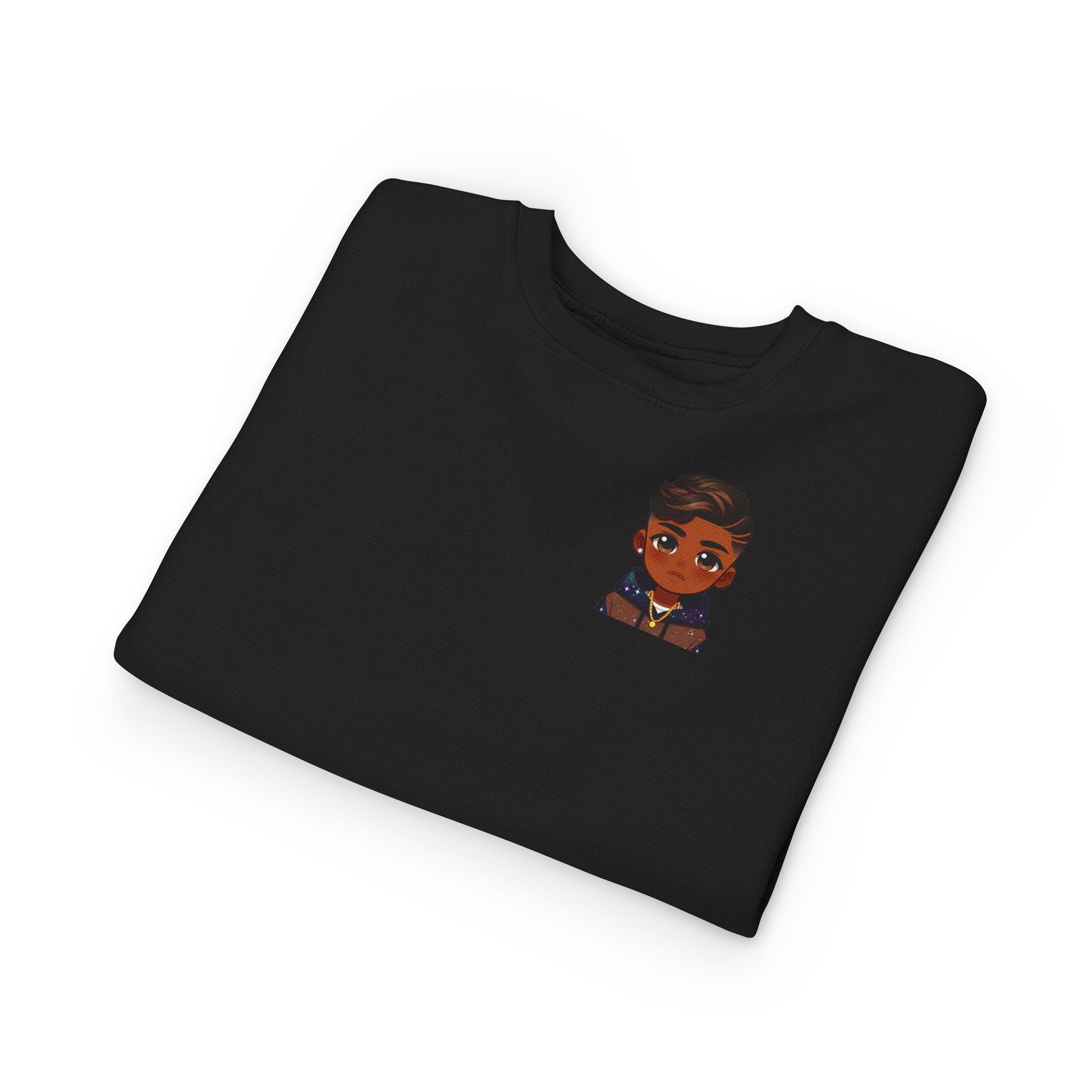A cozy, confident sweatshirt made for little ones who shine. This toddler sweatshirt features a bold cartoon boy with rich brown skin and smooth, waved hair accented by a clean side design and a small diamond stud earring. He wears a glittering brown-to-navy galaxy hoodie, a gold chain and watch, dark blue jeans, and white sneakers — a glam but rugged look that channels playful swagger. The minimal background keeps the focus on the character’s personality: proud, stylish, and full of charm. Soft midweight fabric and thoughtful construction make it comfortable for everyday play, naps, and picture-day moments when you want their style to speak loudest.